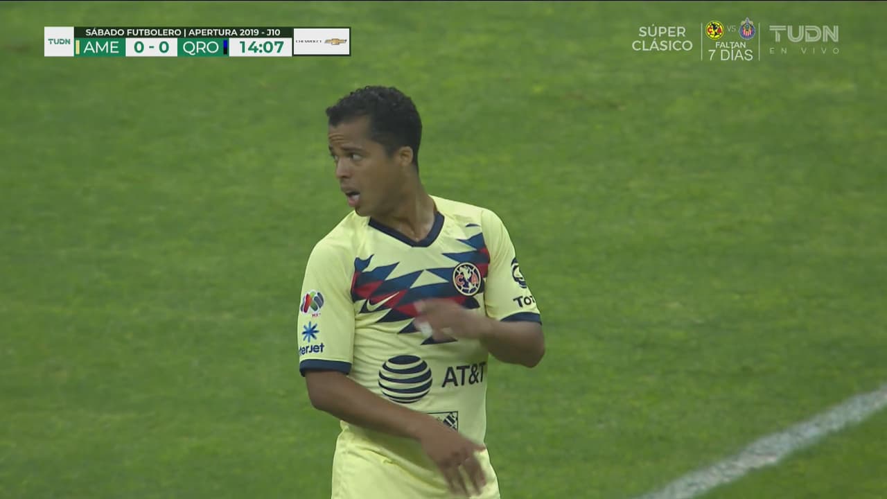 América teje una buena jugada y deja a Gio en posición de marcar; sin embargo, al centrocampista se le escurre la pelota y la deja ir.