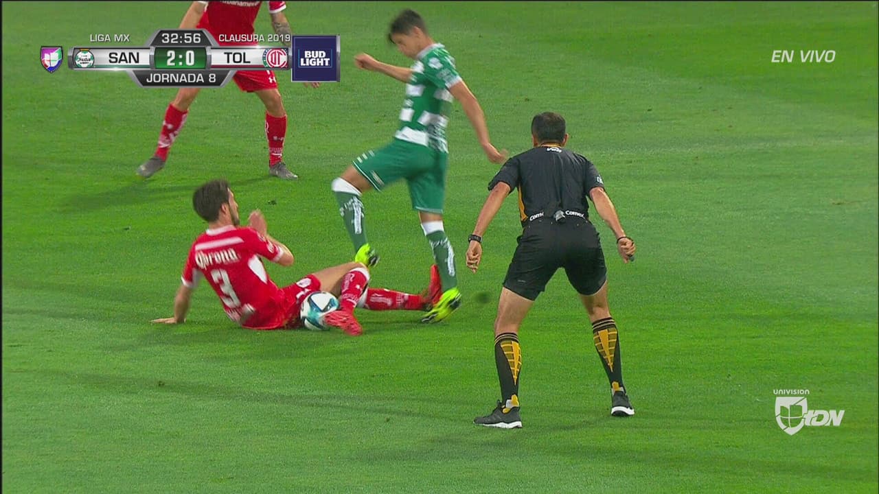 El lateral del Toluca metió la suela en el tobillo del rival.
