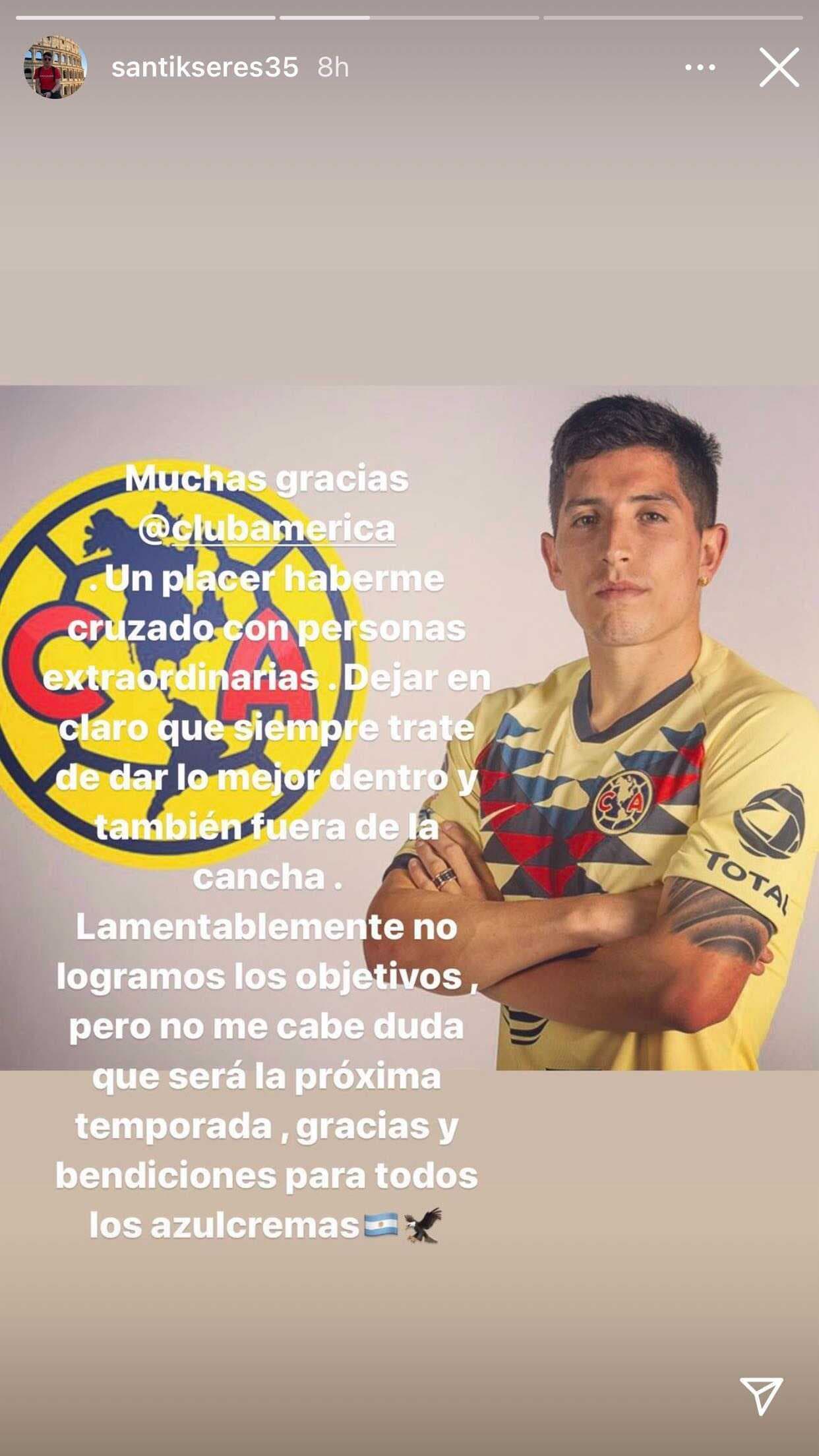 Santiago Cáseres se va del América y se despide de la afición azulcrema con un mensaje donde lamenta su partida sin títulos.