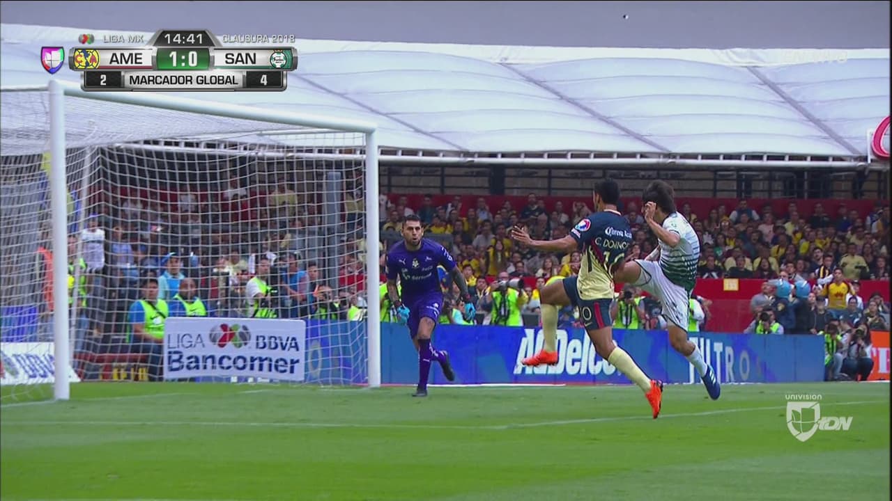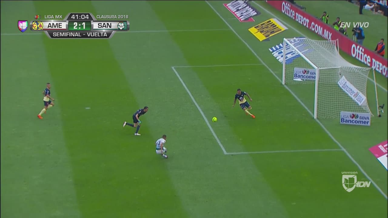 Cerca de finalizar la primera parte la zaga azulcrema se vio sorprendida con un magnifico pase de Brian Lozano para Jonathan Rodriguez que con mucha fortuna logró marcar para los de la comarca y silenciar al Azteca.