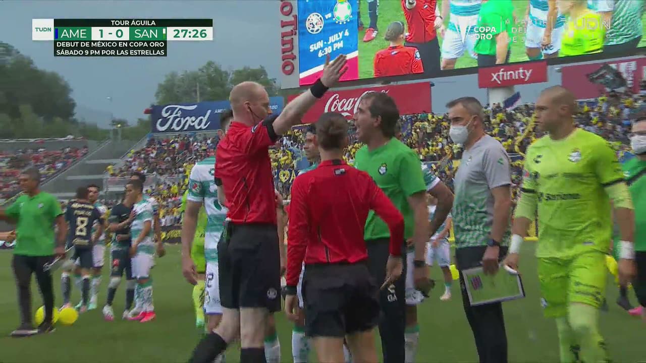 El jugador de Santos se va por una doble tarjeta amarilla y el DT por ser parte de una bronca.