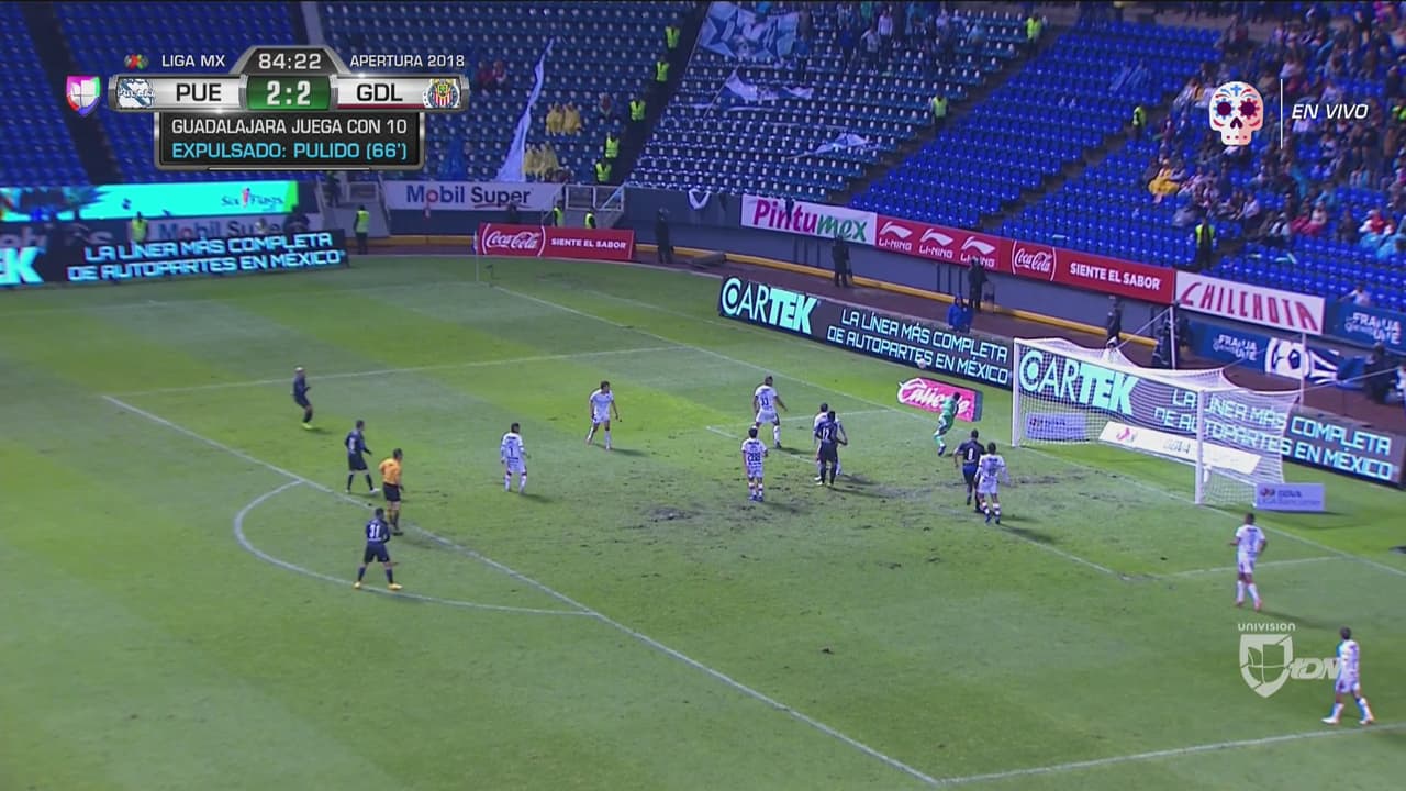 Puebla intenta romper el empate, sabiendo que tiene un hombre más en campo. El arquero de Chivas pudo rechazar, esto sigue 2-2.