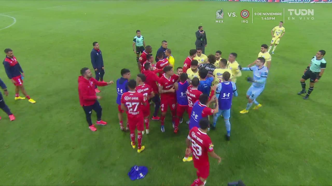 Los jugadores se reúnen en el centro del campo y se calientan los ánimos, tiene que separarlos.