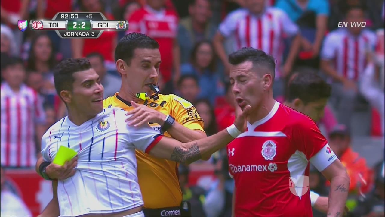 Un jalón de Triverio acabó en amonestación para tres jugadores y una expulsión para el volante de Chivas.