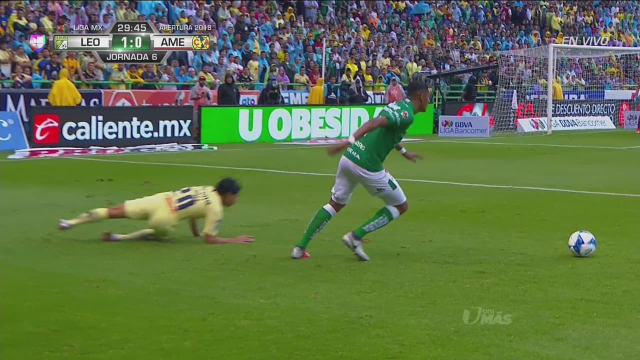 El volante extremo colombiano de León ‘bailó’ a dos jugadores del América. En la primera le cambió de ritmo a Edson Álvarez y en ña segunda dejó en el piso a Lainez con un enganche.