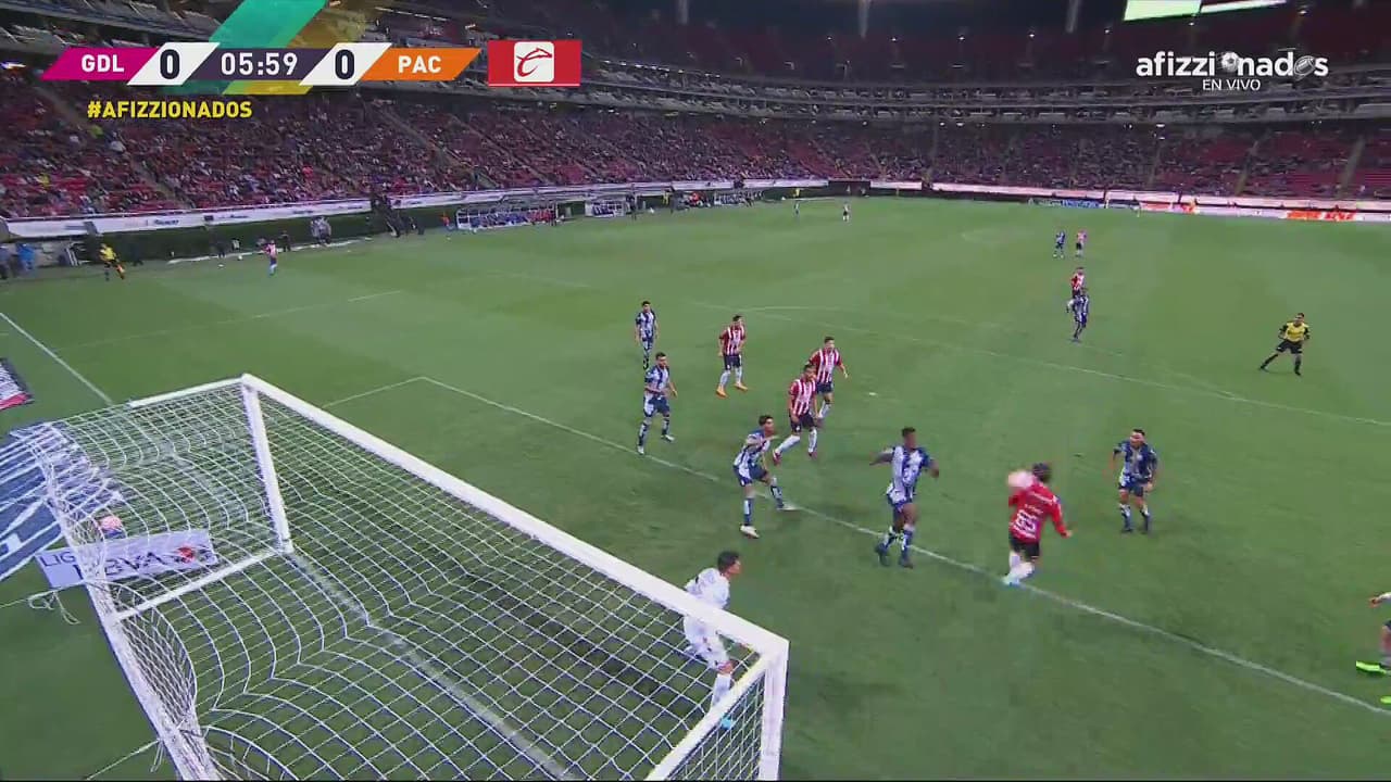 El jugador de las Chivas sacó un débil cabezazo que pegó en el pie de portero de Pachuca tras un córner al 6’.