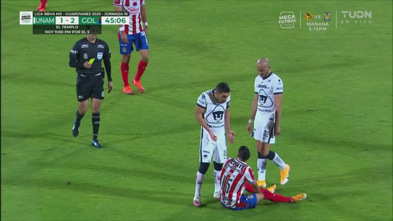 El mediocampista de Pumas recibió la tarjeta amarilla por una falta sobre el jugador de Chivas.