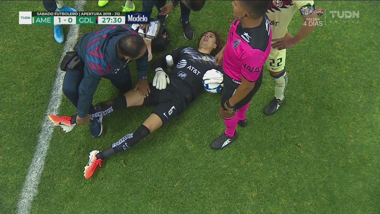 El arquero del América se lastimó cuando fue por un balón sobre el límite de su área al 26’.