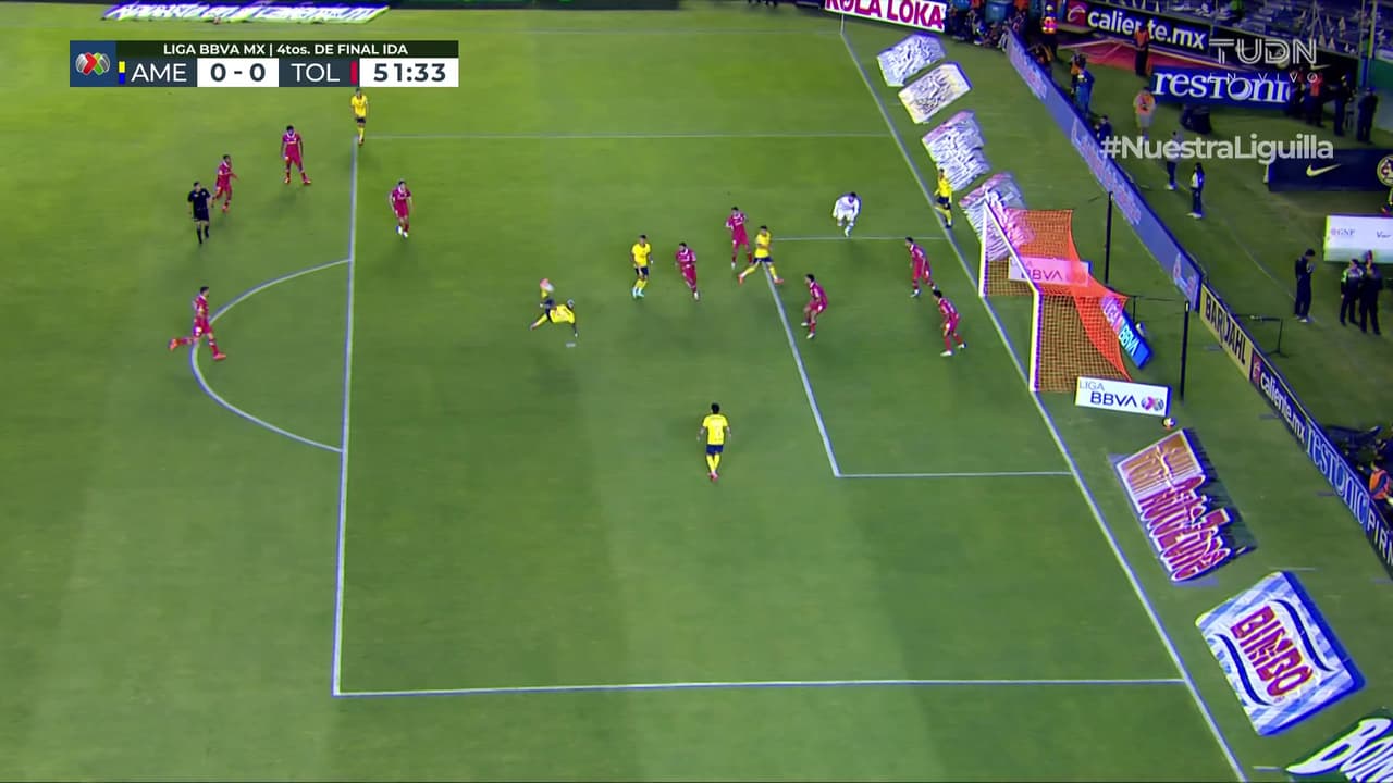 El búfalo Aguirre remata con una chilena que pica y se va por muy poco encima de la portería del Toluca.