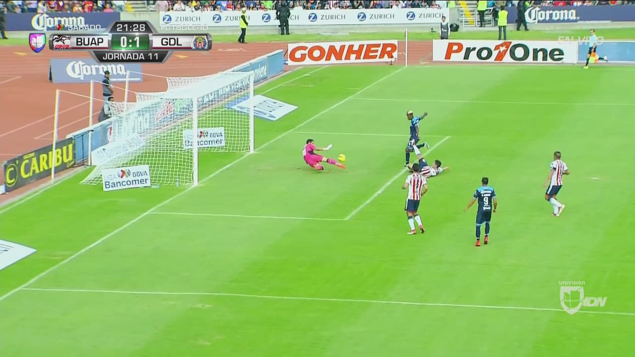 Centro peligroso de los Lobos que intentó cortar Michael Pérez, pero por poco la mete en su propio arco sino fuera porque Rodolfo Cota alcanzó a tapar y así evitar el autogol.