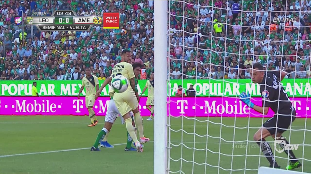 Remate de cabeza del ecuatoriano que se estrelló en el travesaño de Marchesín.