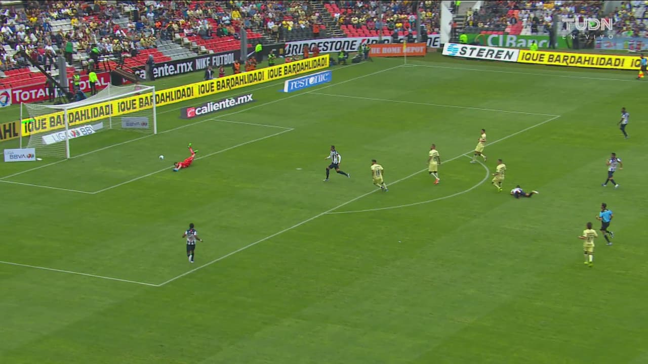 Tras una salida rápida en contragolpe de Rayados de Monterrey, el centrocampista argentino remató y su compatriota tuvo que estirarse para desviar al tiro de esquina.