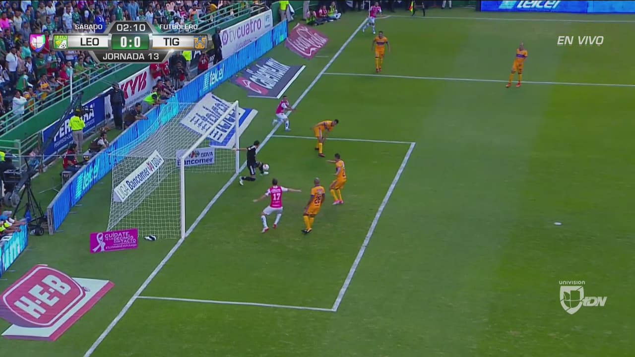 La primera del partido es para León, confusión en el fondo de la zaga de Tigres, con el centro de Navarro y casi autogol de Dueñas. Gran reacción del arquero Nahuel Guzmán