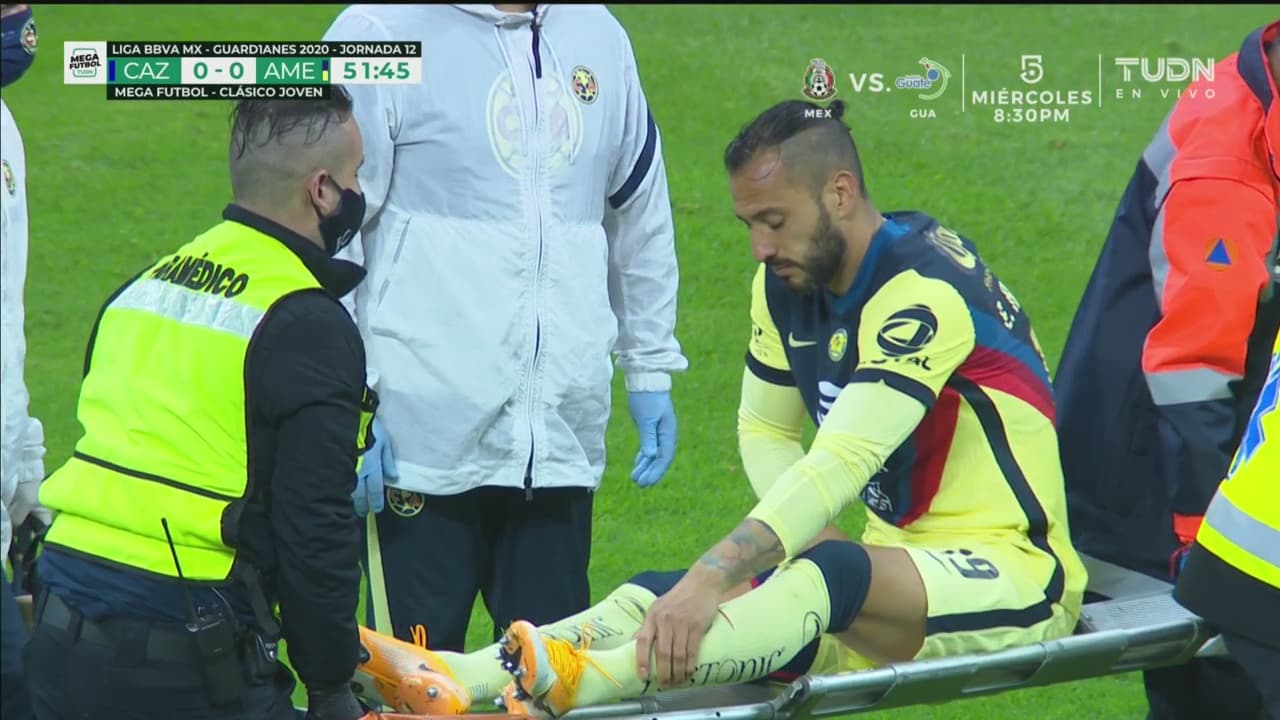 El uruguayo presentó un problema muscular y se tiró al suelo tras un mano a mano en contra de Santiago Giménez, delantero de los cementeros. Acabó por abandonar la cancha a los 39' y Ramón Juárez ocupó su lugar.
