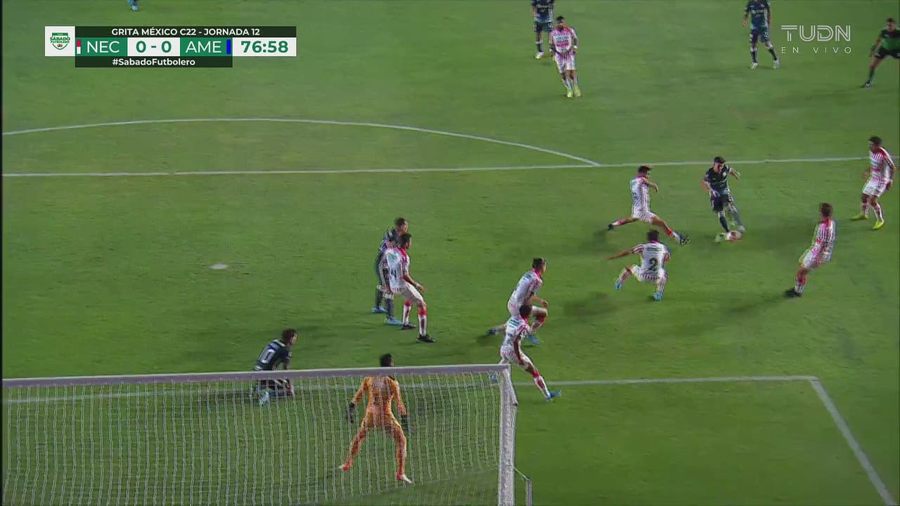Martínez se quita a dos de Necaxa y el disparo de Alejandro se estrella en la red, pero por fuera, al 77'.