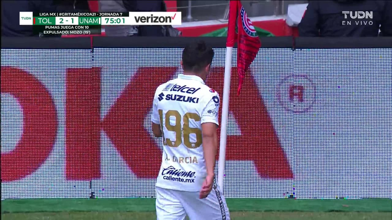 Ángel García (Pumas UNAM) segunda tarjeta amarilla por juego peligroso.