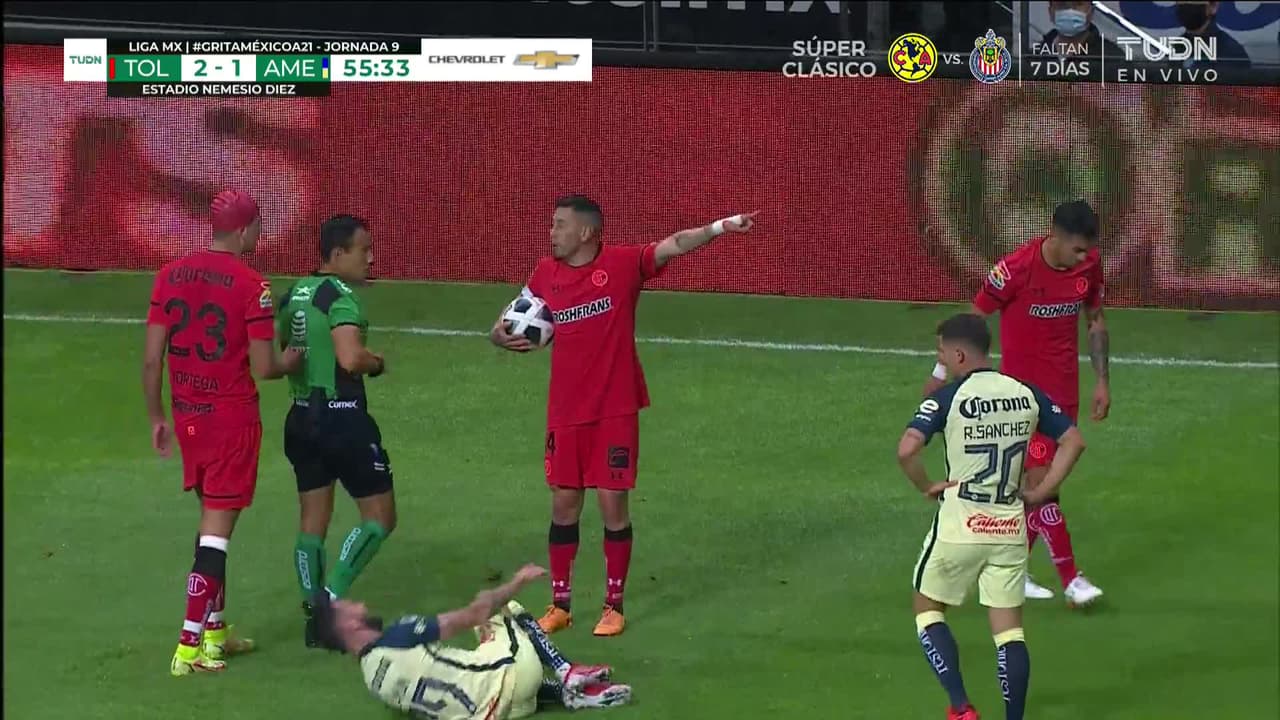 Claudio Baeza (Toluca) segunda tarjeta amarilla por juego peligroso.
