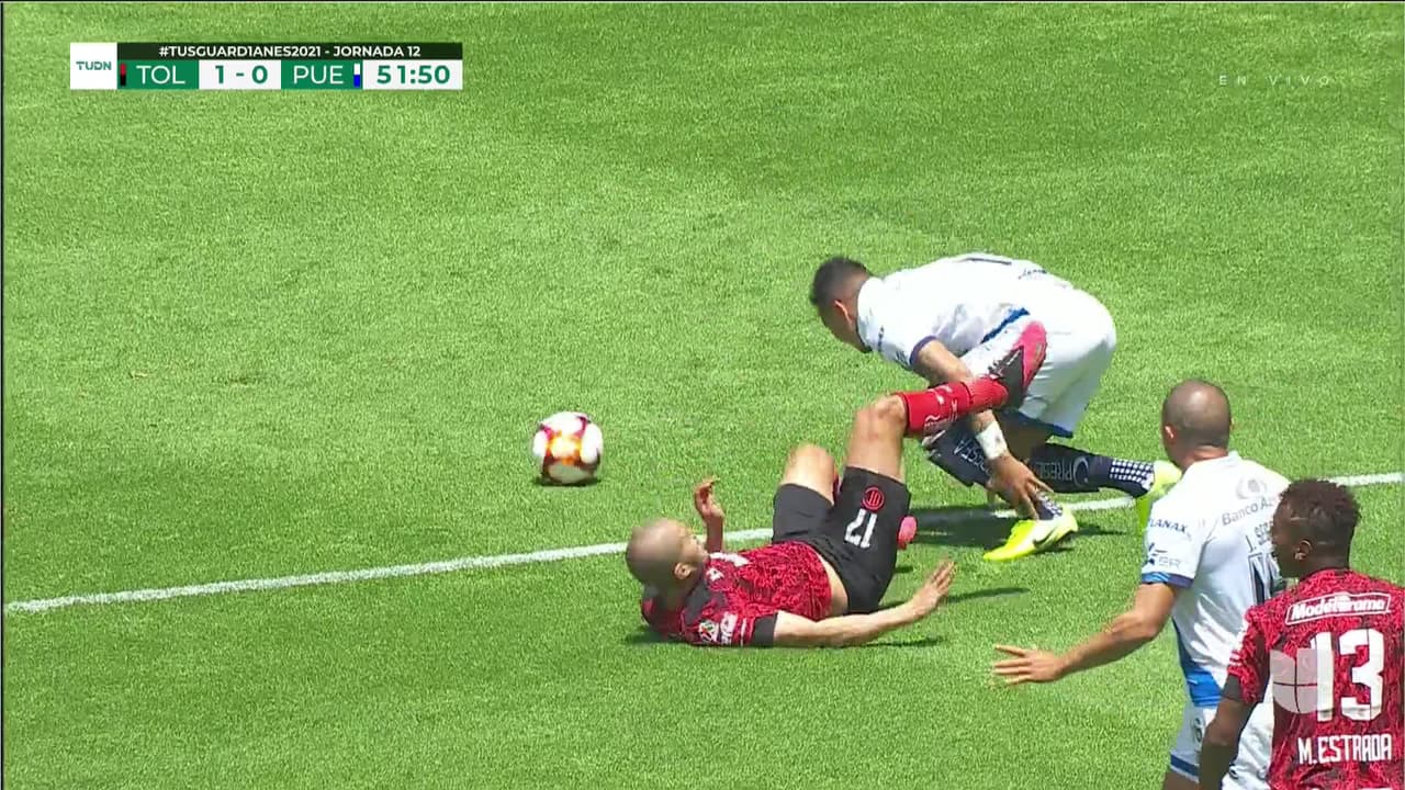 Emanuel Gularte (Puebla) segunda tarjeta amarilla por juego peligroso.