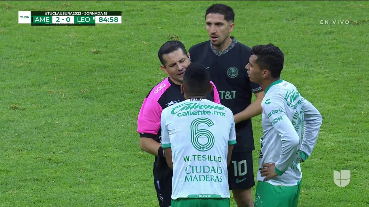 William Tesillo (León) segunda tarjeta amarilla por juego peligroso.