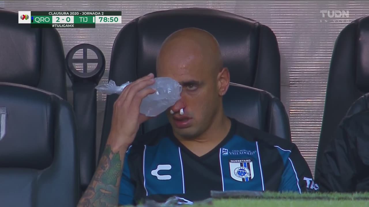 El delantero de Querétaro se llevó la peor parte al exponer su tabique y tener un sangrado después de disputar la pelota con el defensa de Xolos.