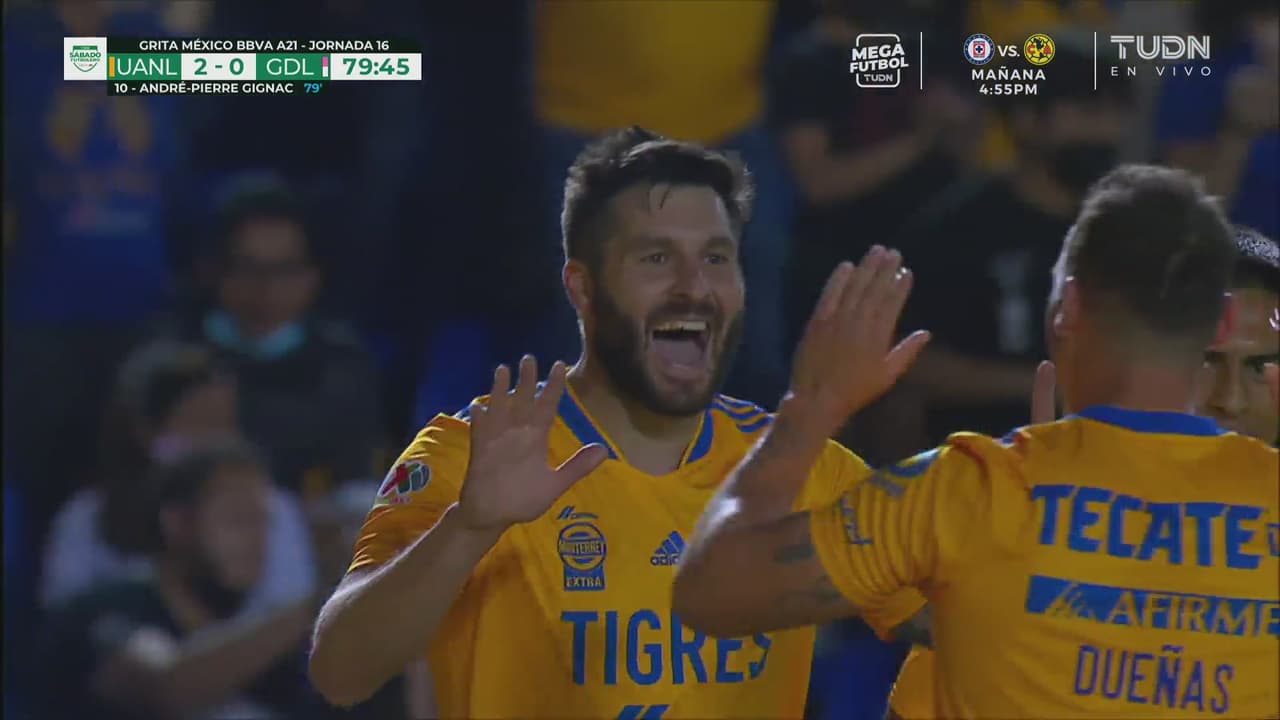 Tigres definió el partido en cuatro minutos; un golazo de André-Pierre Gignac a los cuatro minutos de juego puso en ventaja a los felinos y la mantuvo hasta el Final para derrotar a Chivas e incluso ampliar el marcador para ganar 2-1 en la Jornada 16 del Grita México BBVA A21.