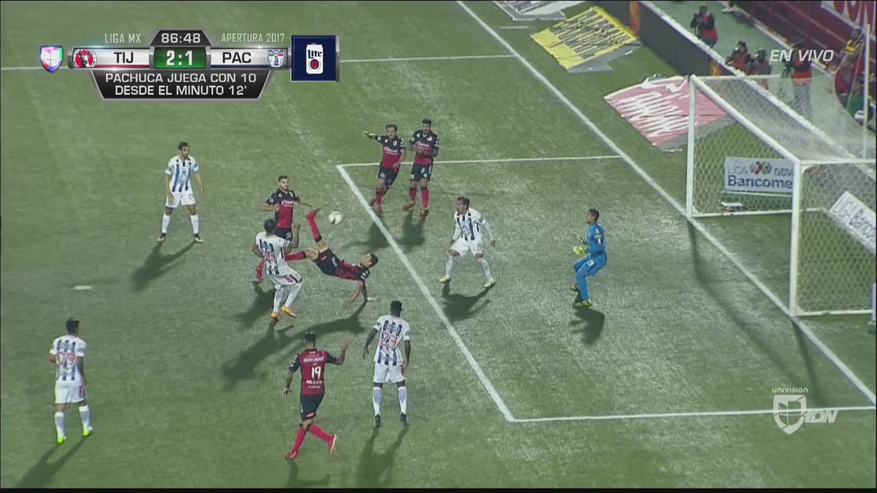 Cuando restaban apenas tres minutos para el final del partido y más apretaba Tijuana, en un tiro de esquina, Damián Musto le dio la victoria a Xolos. El argentino recibió un rebote dentro del área luego que un defensor de Pachuca la tocó con la mano, y amortiguando la pelota con el pecho Musto sacó una chilena brillante que se abrazó la red.