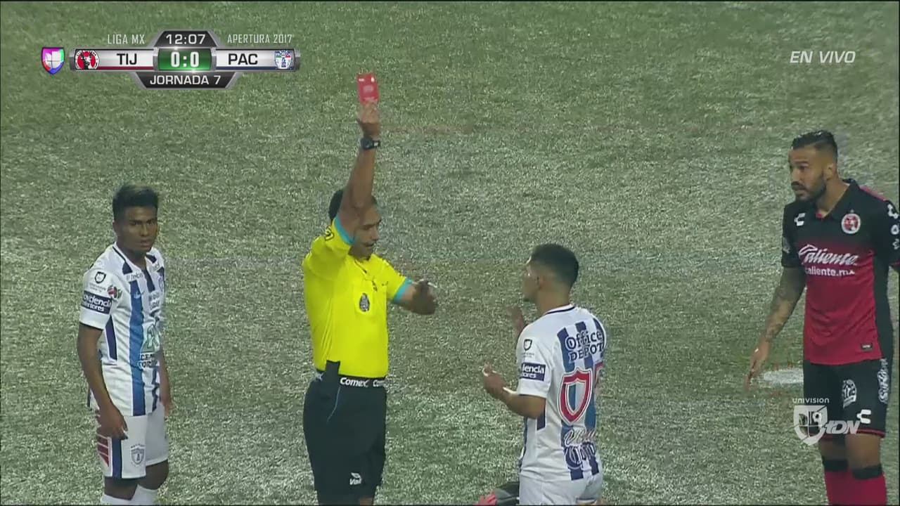 El árbitro Roberto García Orozco no dudó en señalar la falta en ataque y le mostró la tarjeta roja directa al jugador de Pachuca.