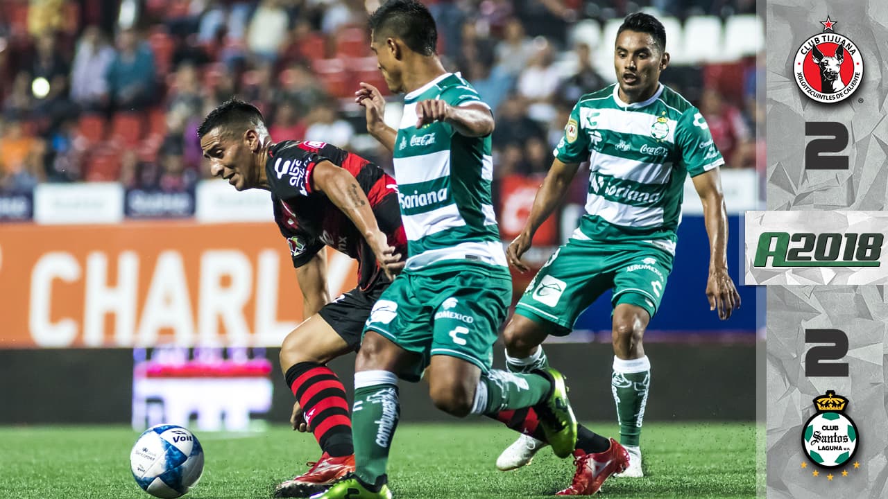 El campeón Santos estuvo cerca de cortar su racha de imbatibilidad, pero al final empató 2-2 ante Tijuana en la Jornada 6 del Apertura 2018.