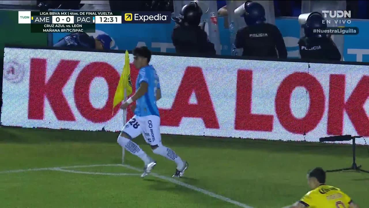 Tiro atajado. Alán Bautista (Pachuca) Disparo con la derecha desde fuera del área.