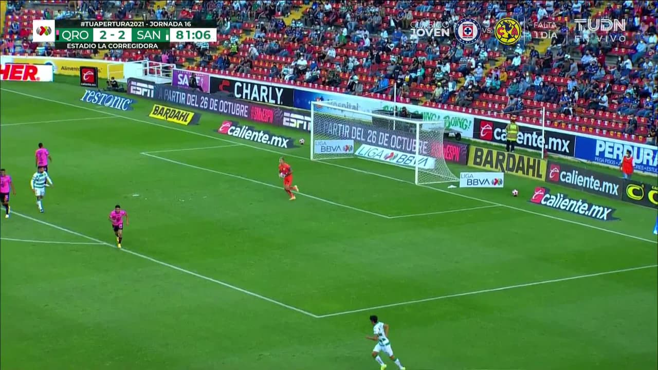 Tiro atajado raso al centro del arco. Alan Cervantes (Santos Laguna) Disparo con la derecha desde fuera del área. Asistencia de Fernando Gorriarán.