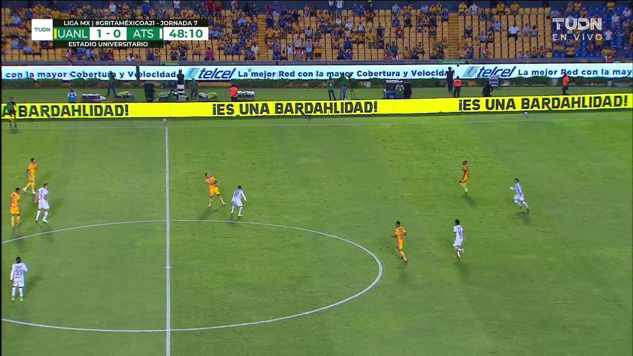 Tiro atajado raso al centro del arco. Aldo Cruz (Tigres) zurdazo desde el lado izquierdo dentro del área. Asistencia de Nahuel Guzmán pase largo.