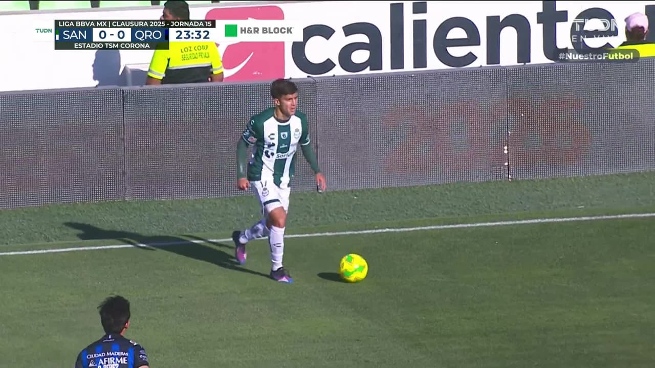 Tiro atajado raso al centro del arco. Aldo López (Santos Laguna) disparo de cabeza desde el centro del área. Asistencia de Ramiro Sordo con un centro al área.