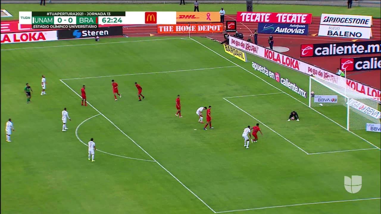 Tiro atajado. Alek Álvarez (Pumas UNAM) Disparo con la derecha desde fuera del área.