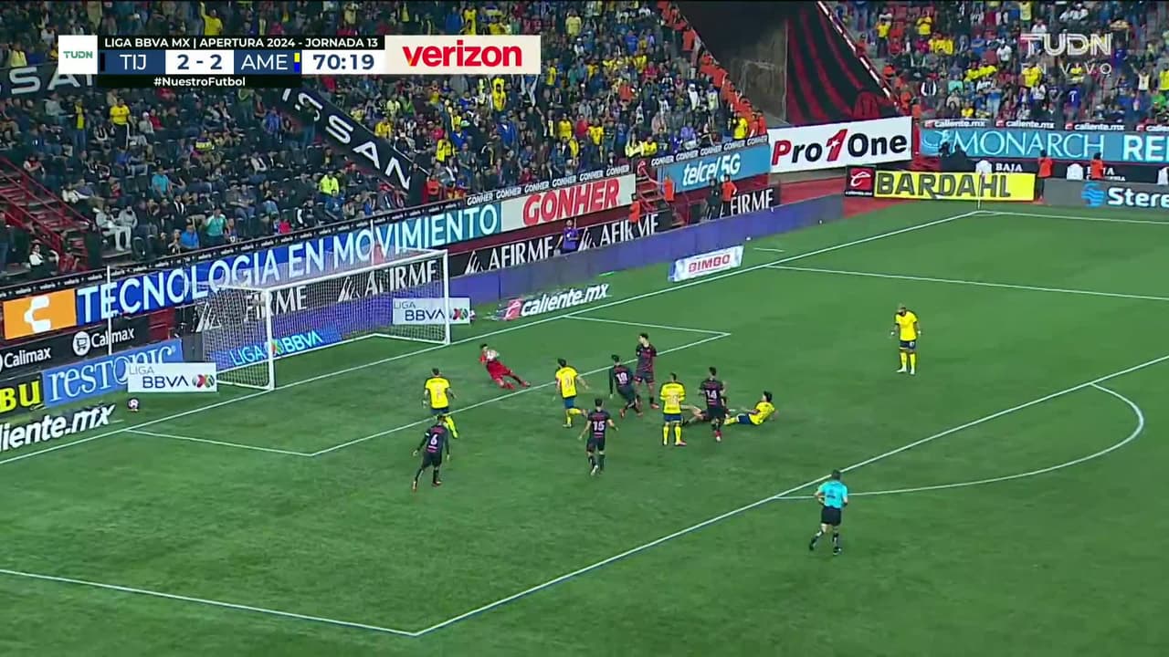 Tiro atajado. Álex Zendejas (América) Disparo con la derecha desde fuera del área.