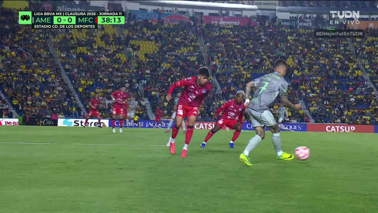 Tiro atajado raso al centro del arco. Álex Zendejas (América) disparo de cabeza desde el centro del área. Asistencia de Jonathan dos Santos.