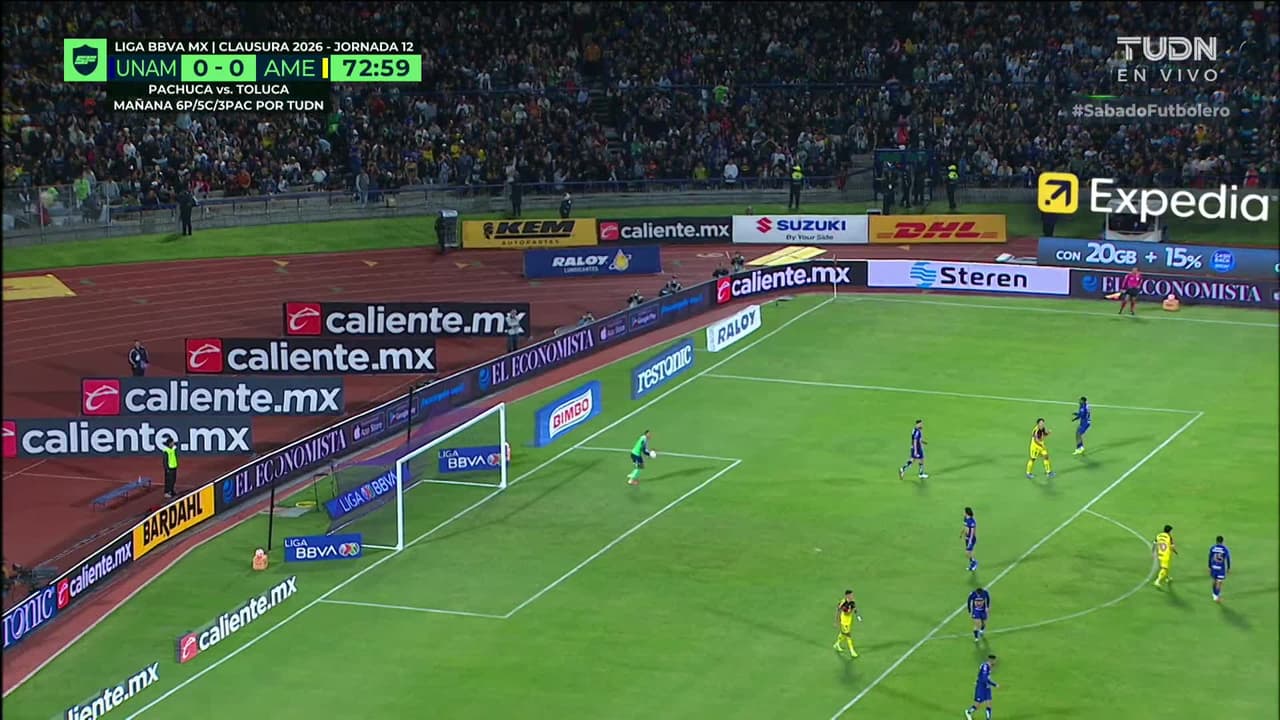Tiro atajado junto al lado derecho de la portería. Álex Zendejas (América) zurdazo desde fuera del área. Asistencia de Patricio Salas.