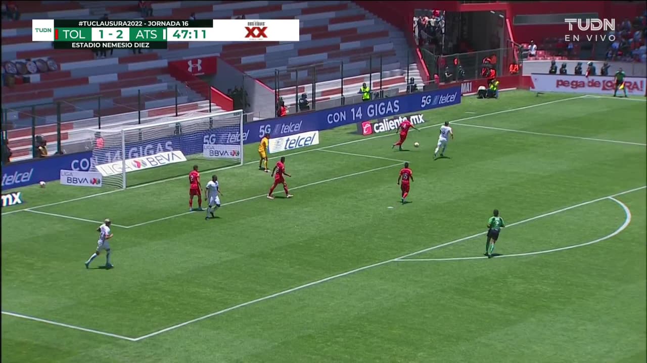 Tiro atajado junto al lado derecho de la portería. Alexis Canelo (Toluca) zurdazo desde el lado izquierdo dentro del área.