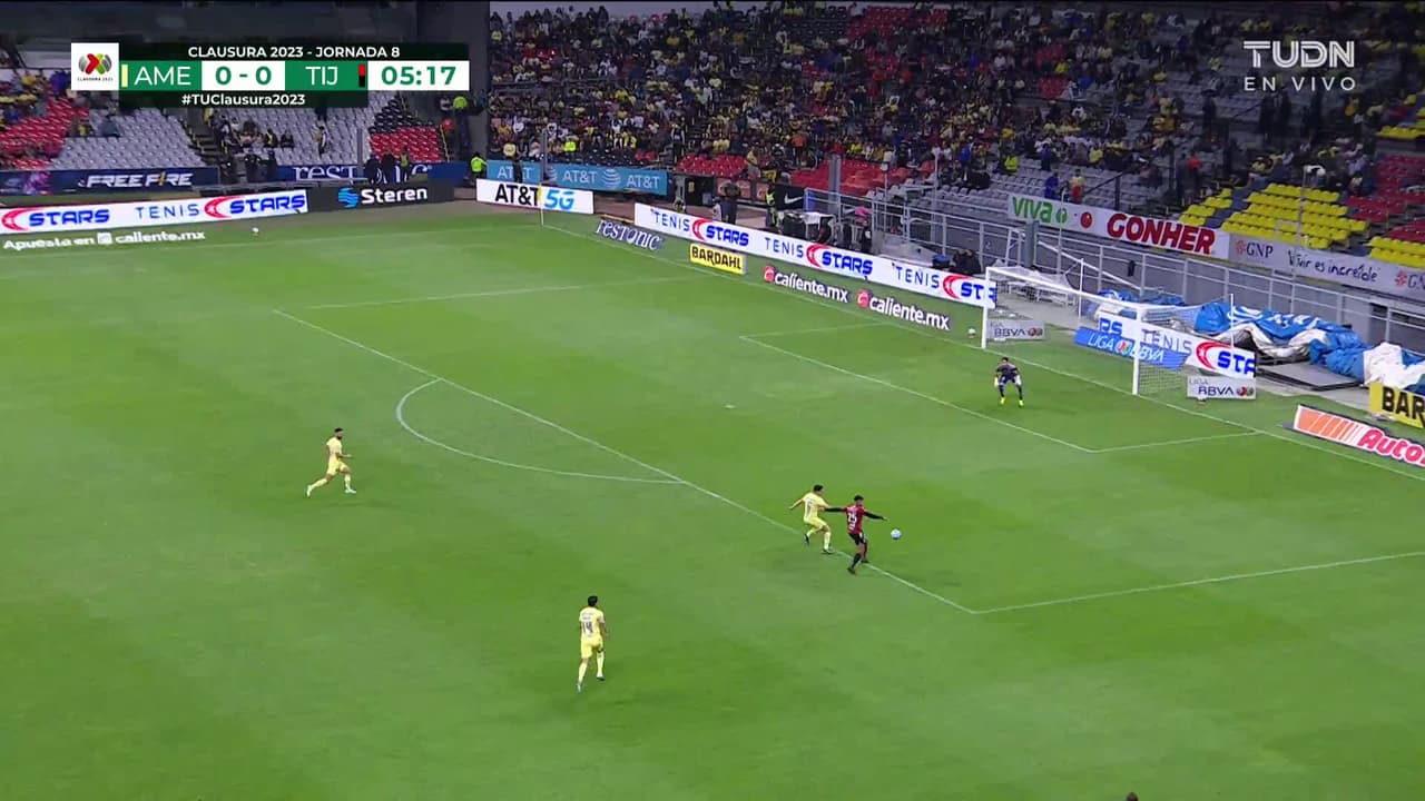 Tiro atajado raso al centro del arco. Alexis Canelo (Club Tijuana) Disparo con la derecha desde el lado derecho dentro del área.