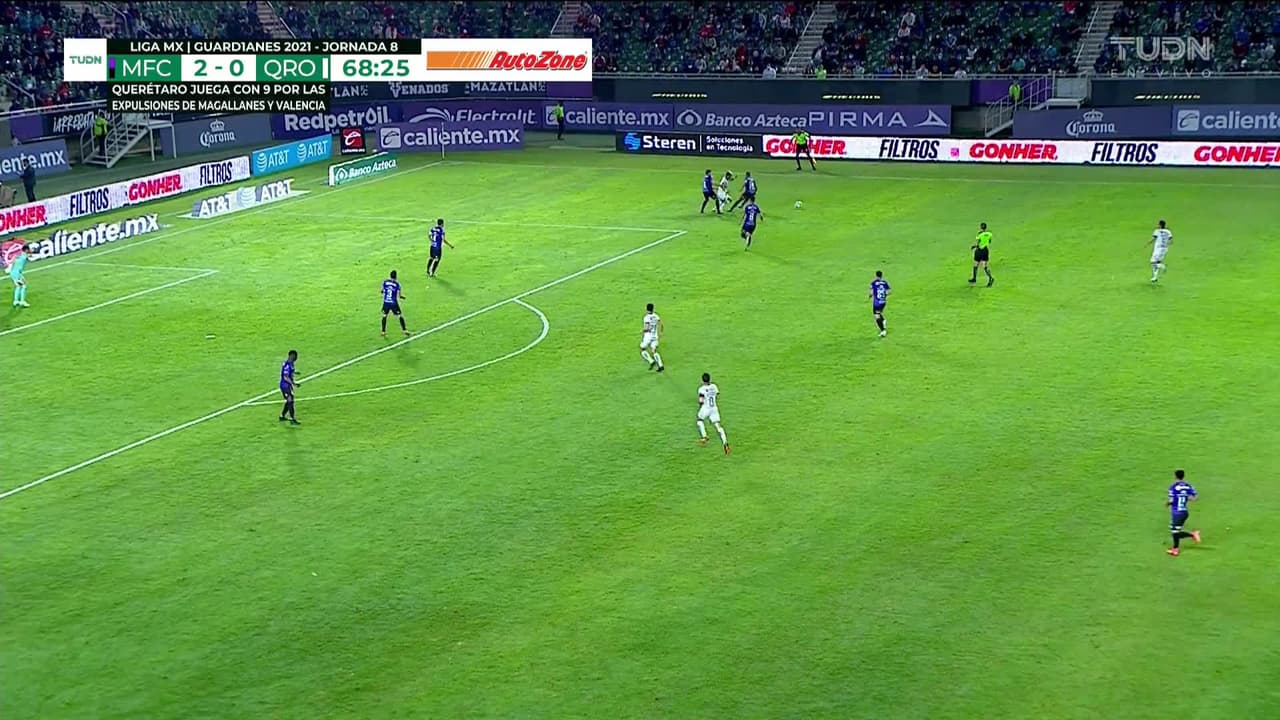 Tiro atajado Por arriba en el centro del arco. Alexis Doldán (Querétaro) zurdazo desde más de 30 metros.