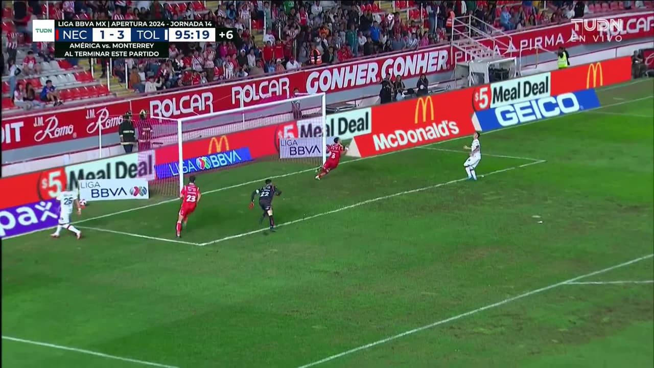 Tiro atajado junto al lado derecho de la portería. Alexis Vega (Toluca) Disparo con la derecha desde el lado izquierdo dentro del área. Asistencia de Paulinho.