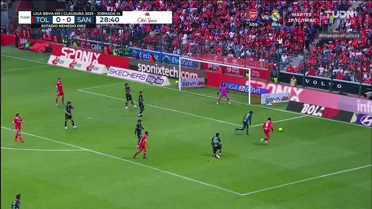 Tiro atajado raso al centro del arco. Alexis Vega (Toluca) Disparo con la derecha desde el lado derecho dentro del área. Asistencia de Jesús Angulo.
