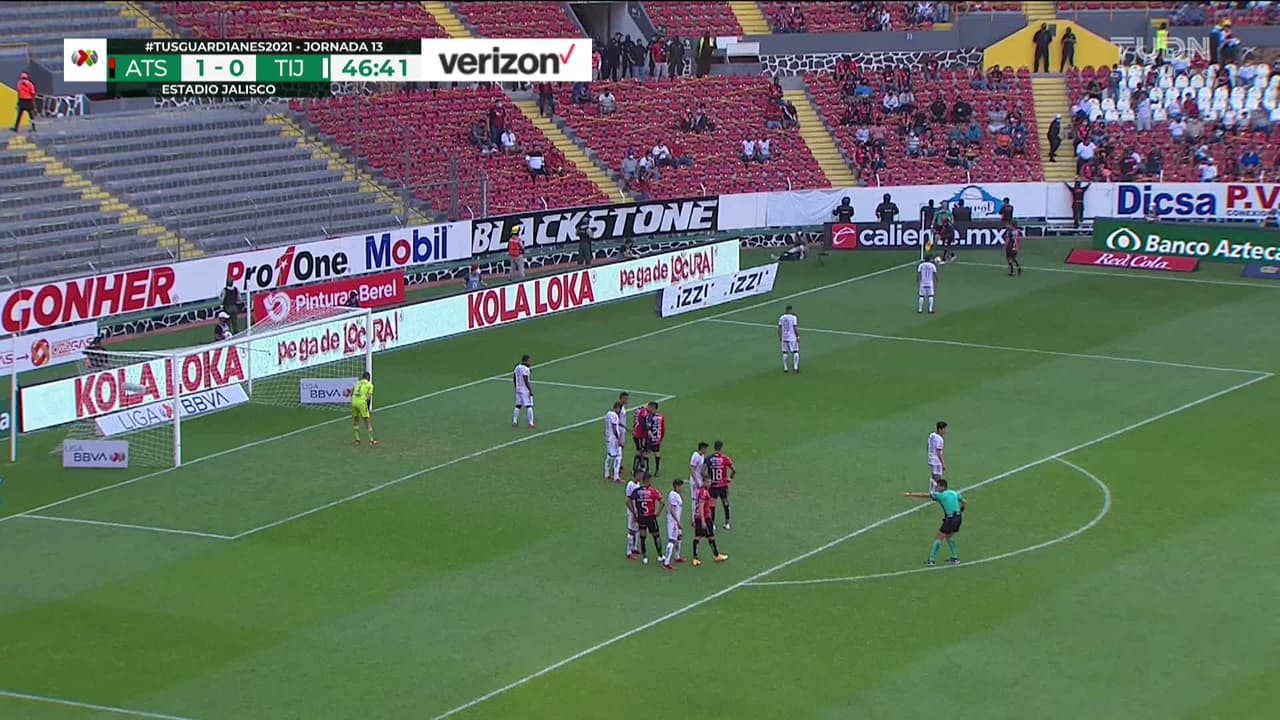 Tiro atajado al ángulo superior derecho. Ángel Márquez (Atlas) Disparo con la derecha desde fuera del área. Asistencia de Jairo Torres pase largo.