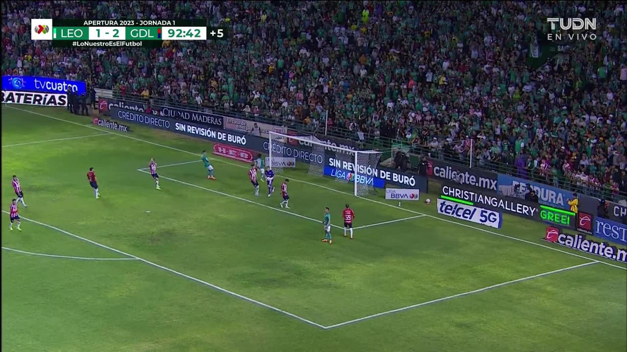 Tiro atajado por abajo a la izquierda. Ángel Mena (León) disparo de cabeza desde el lado derecho dentro del área. Asistencia de Omar Fernández.