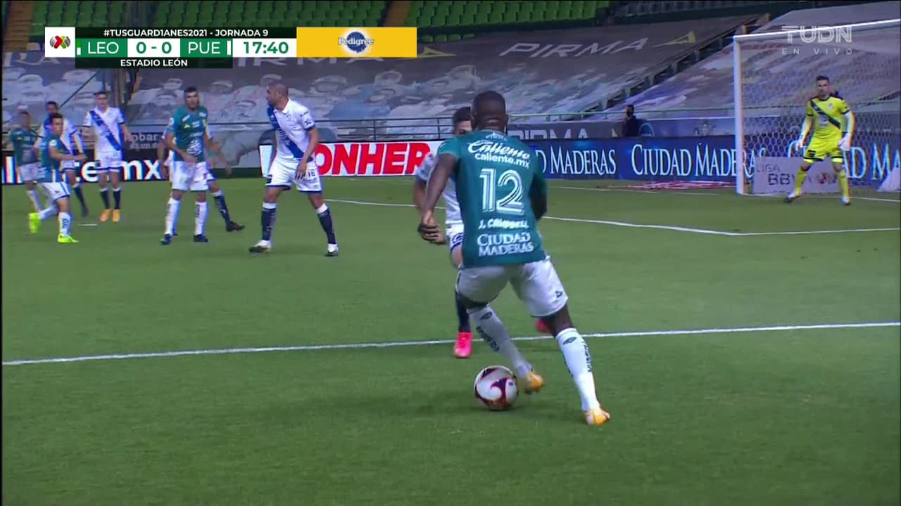Tiro atajado raso al centro del arco. Ángel Mena (León) zurdazo desde fuera del área. Asistencia de Joel Campbell.