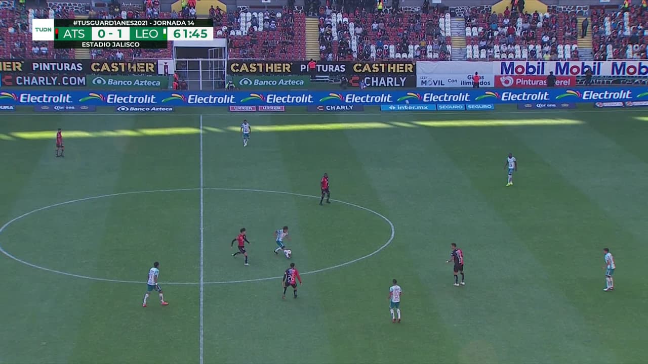 Tiro atajado raso al centro del arco. Ángel Mena (León) Disparo con la derecha sin ángulo desde la derecha. Asistencia de Luis Montes.