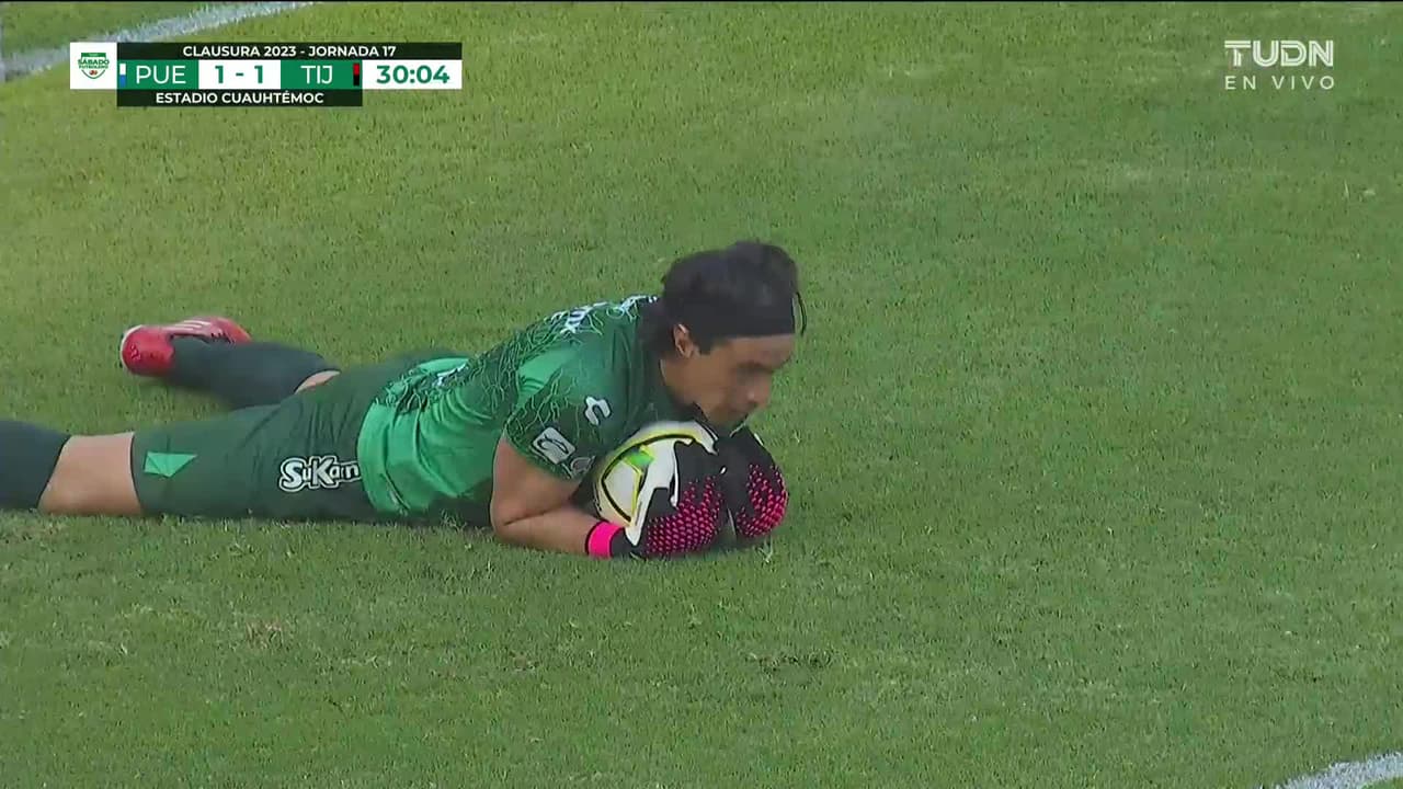 Tiro atajado raso al centro del arco. Ángel Robles (Puebla) zurdazo desde fuera del área.