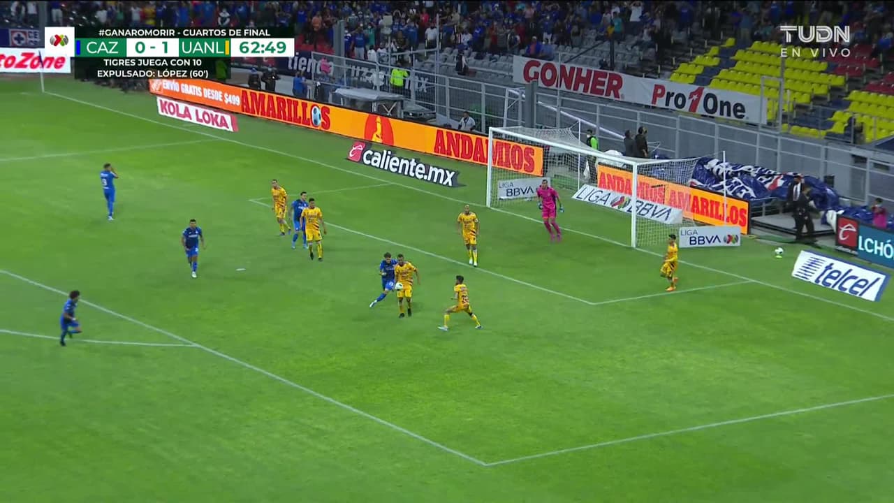 Tiro atajado raso al centro del arco. Ángel Romero (Cruz Azul) zurdazo desde el centro del área. Asistencia de Uriel Antuna con un centro al área.
