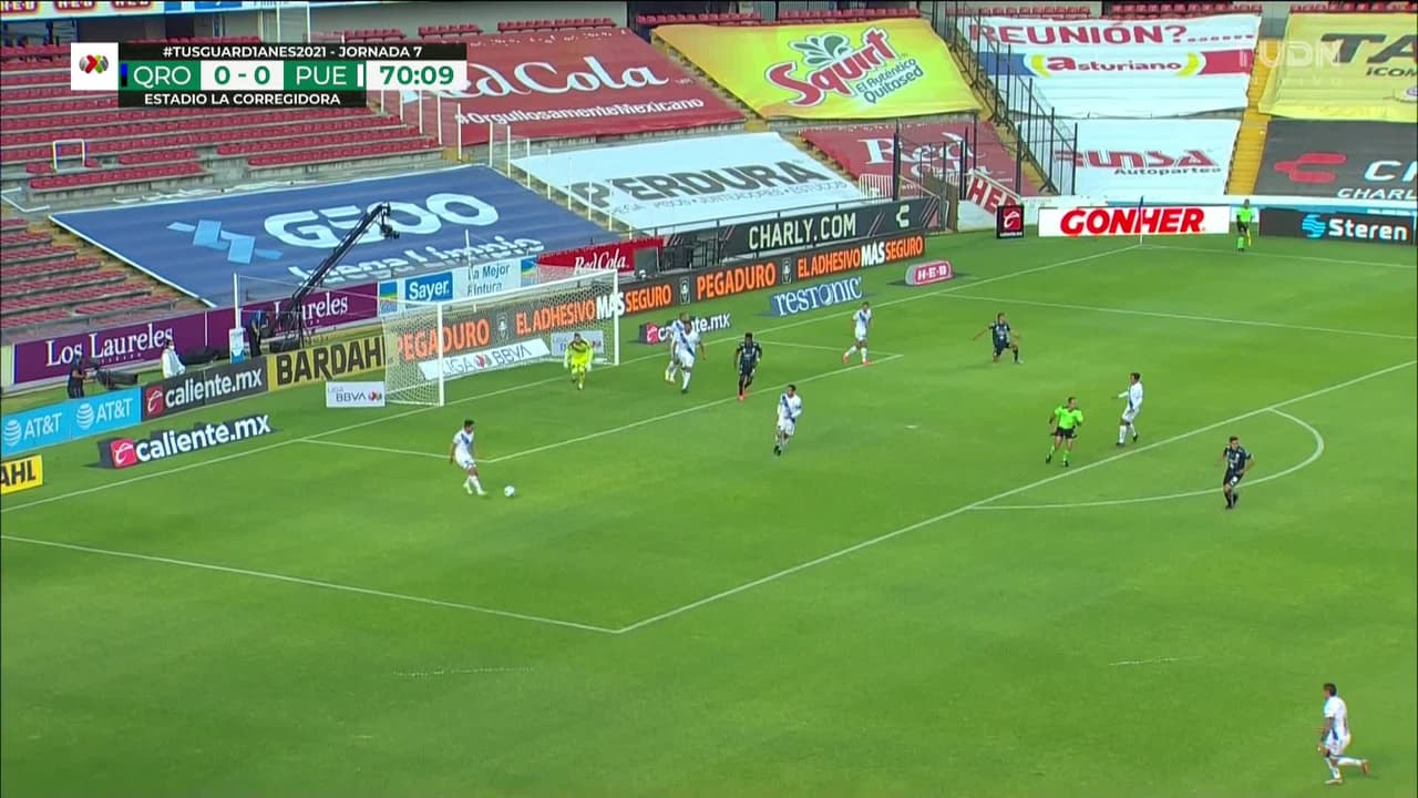Tiro atajado raso al centro del arco. Ángel Sepúlveda (Querétaro) disparo de cabeza desde el centro del área. Asistencia de Kevin Ramírez con un centro al área.