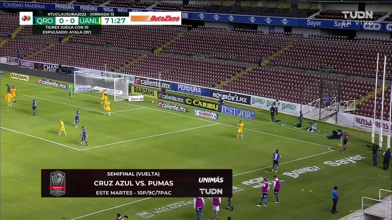 Tiro atajado Por arriba en el centro del arco. Ángel Sepúlveda (Querétaro) disparo de cabeza desde muy cerca. Asistencia de Pablo Barrera con un centro al área.