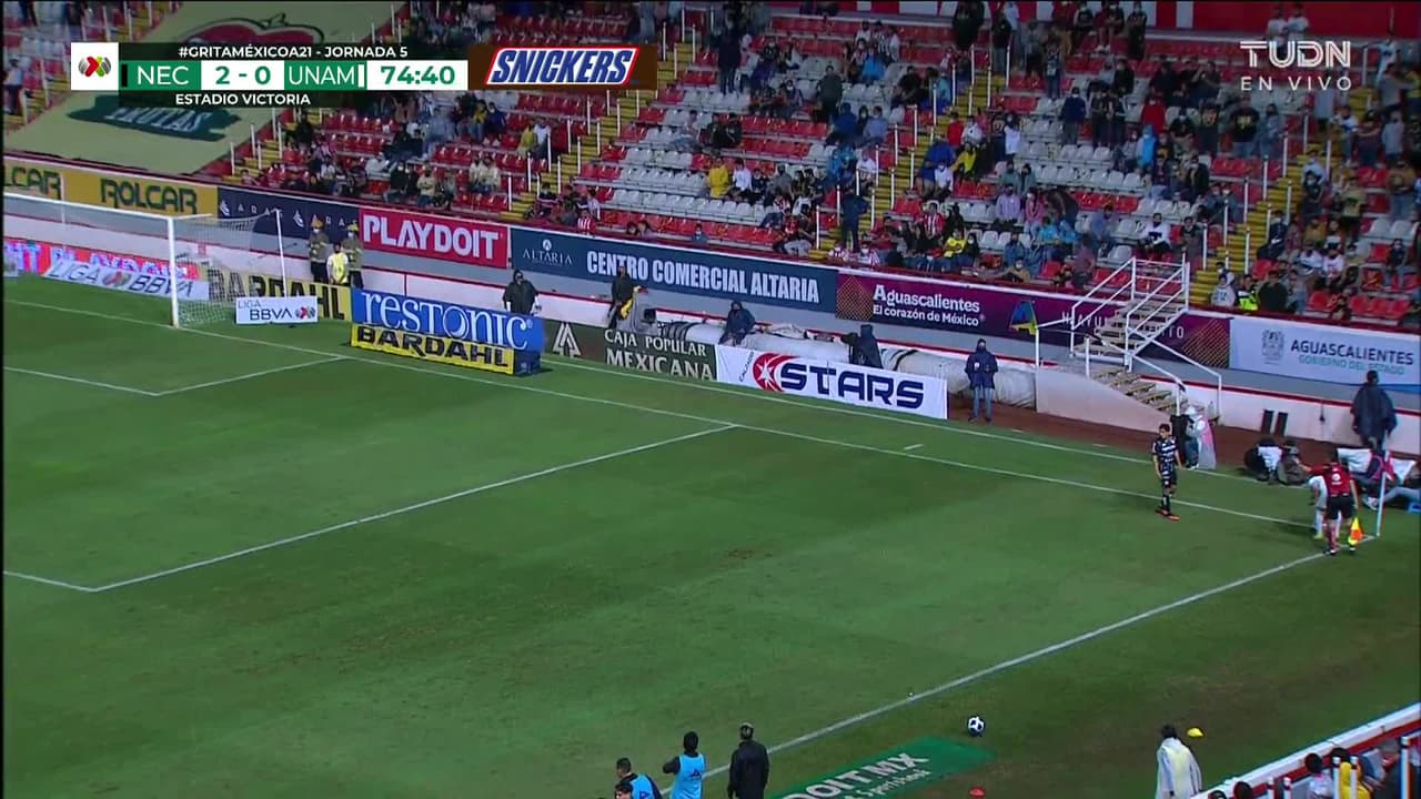 Tiro atajado raso al centro del arco. Arturo Ortíz (Pumas UNAM) Disparo con la derecha desde fuera del área. Asistencia de Leonel López.